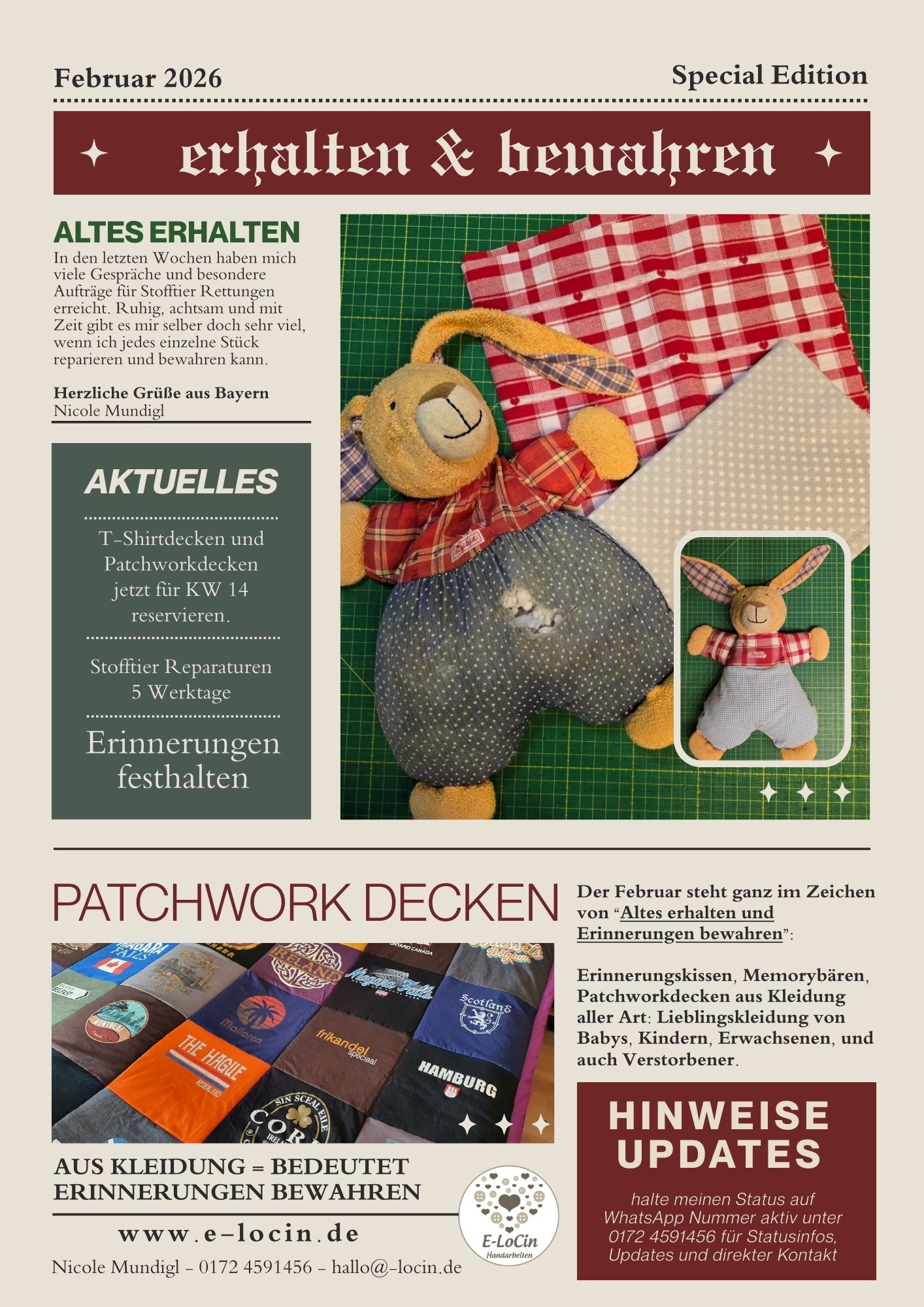 Ich nähe individuelle Patchworkdecken aus deinen T-Shirts, Kleidung oder genäht aus Kleidung Verstorbener, personalisierte Erinnerungskissen aus Kleidung und neuen Stoffen. Ferner repariere ich unsere geliebten Kuscheltiere bei der Stofftier-Reparatur & Stofftier Rettung. Alles in ruhige, liebevolle Handarbeit aus Oberbayern zum fairen Preis ♥
