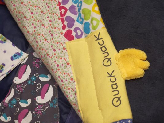 - Ohne Extrakosten nähe ich 3 – 5 Erstlingsausstattung direkt auf die Decke auf. Es sollten nicht mehr sein, sonst wird die Decke zu unförming und schwer