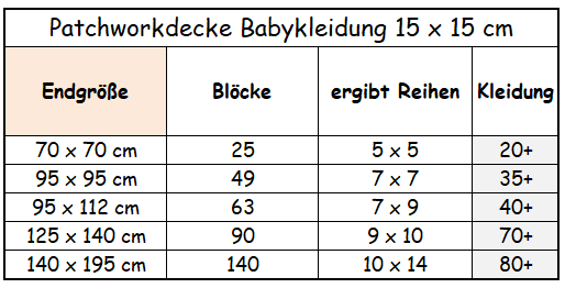 - Hauptsächlich Babykleidung & Erstlingsausstattung? Da ist das Schnittmaß 15 x 15 cm und bei diesen Deckengrößen wähle dann bitte “Babykleidung” extra aus (wegen wesentlich mehr Kleidung, Schnittmenge, Aufwand etc.) Achte auf die leicht unterschiedlichen Deckenendgrößen. Maßgeblich ist bei diesen Decken dann diese Größentabelle: