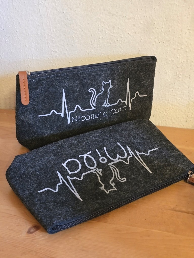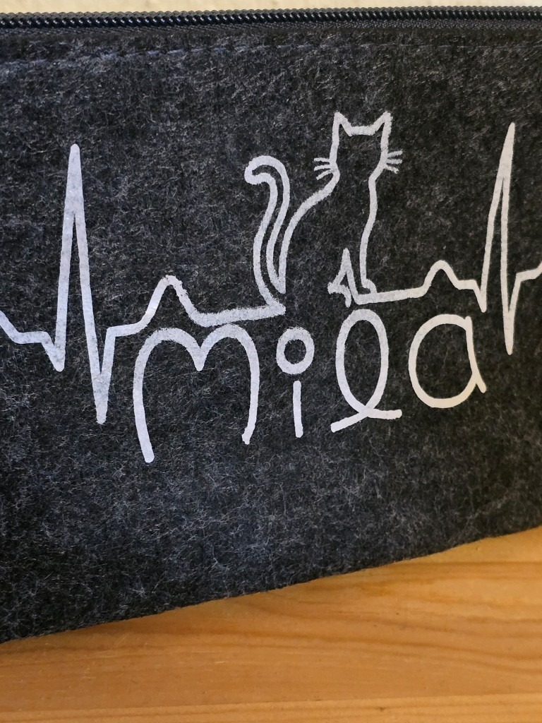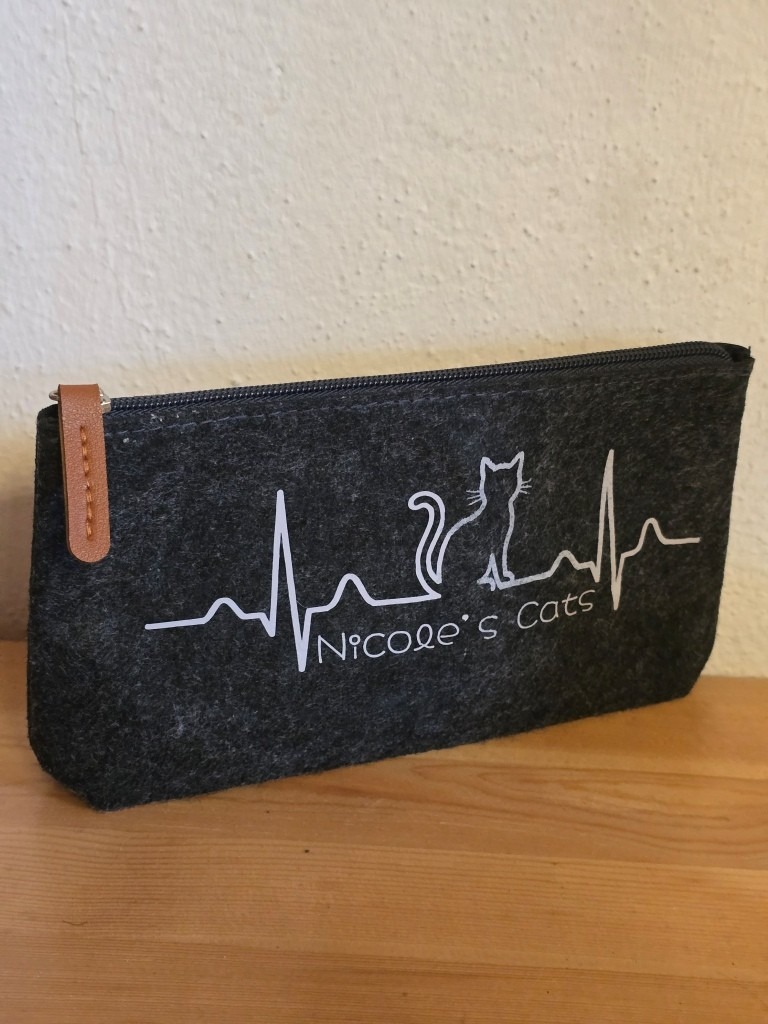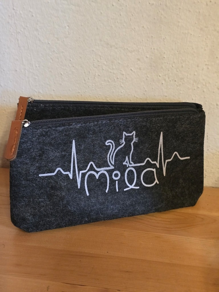 Dieses süße anthrazitfarbene Filz-Kosmetiktäschchen beschrifte ich individuell mit den typischen Herzschlag und einer kleinen Katze sowie Deinem Wunschname direkt auf das robuste Täschchen. Ein personalisiertes Stück für Katzenliebhaber, z.B. um die „Katzenapotheke“ oder andere kleine Schätze stilvoll aufzubewahren.