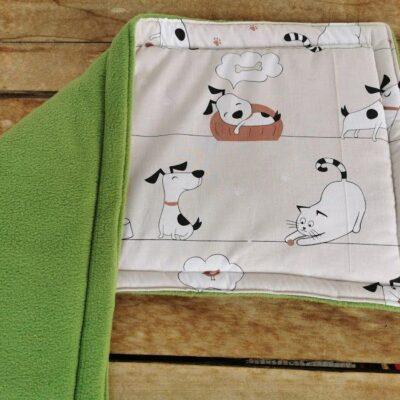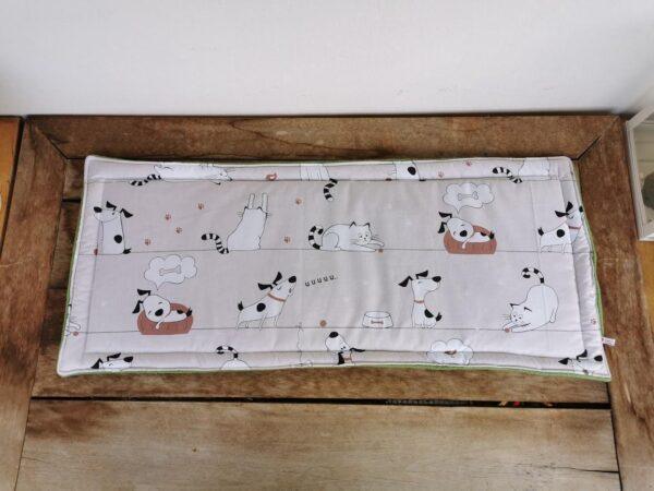 Es gibt lange und große Fensterbänke, Sitzbänke oder Couchbereiche, wo sich Dein Hundi oder Katzerl auch bequem betten wollen. Diese lange Unterlage ist aus einem putzigen Baumwollstoff mit lauter verspielten Hunden und Katzen genäht. Innen ist die Unterlage mit 2 cm dickem Volumenvlies wattiert und fest durch das Absteppen vernäht, sodass auch beim Waschen nichts verrutschen kann. Auf der Rückseite ist passender weicher Antipilling Fleece vernäht.