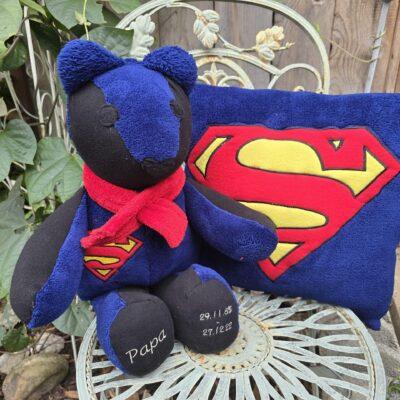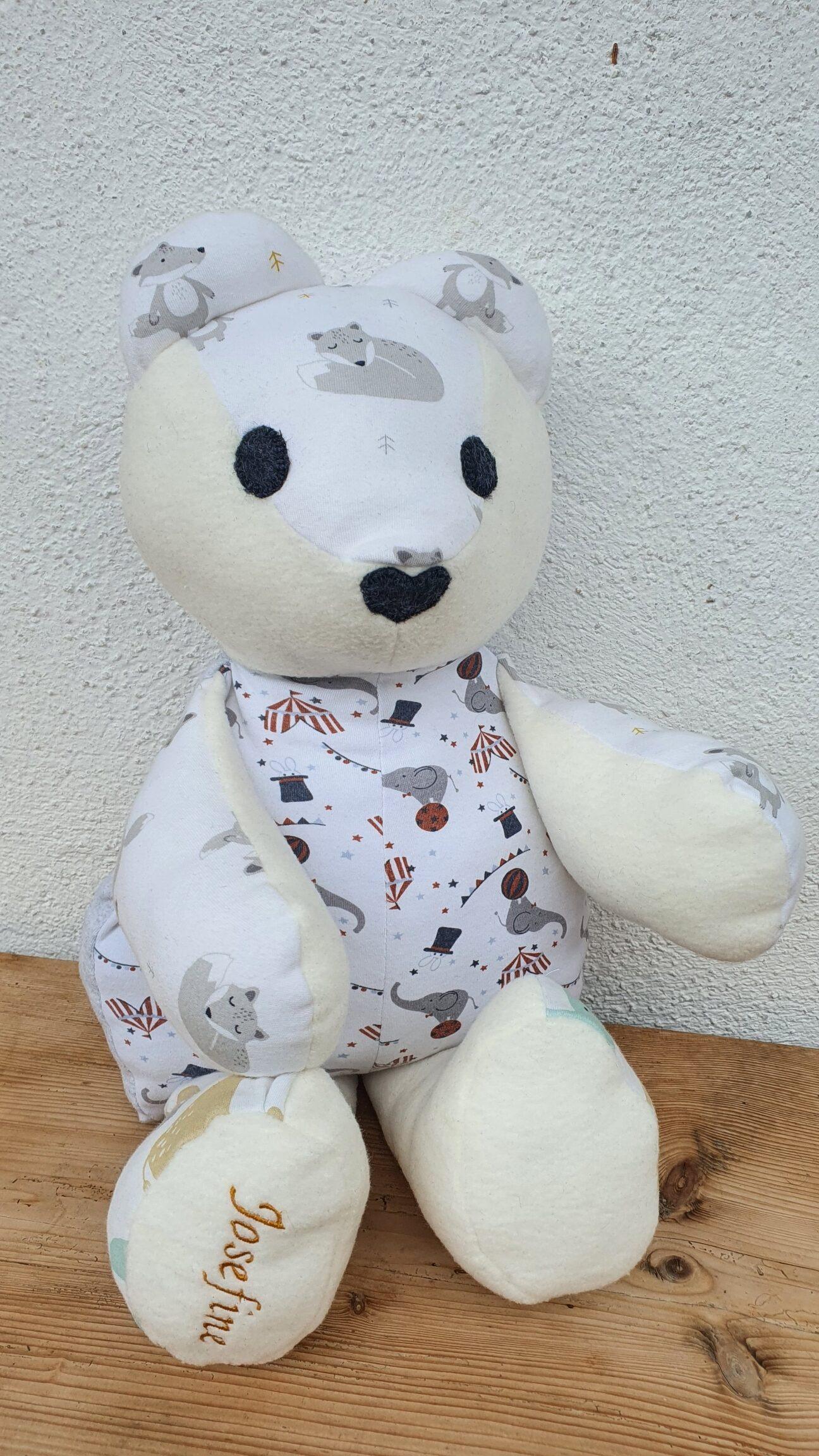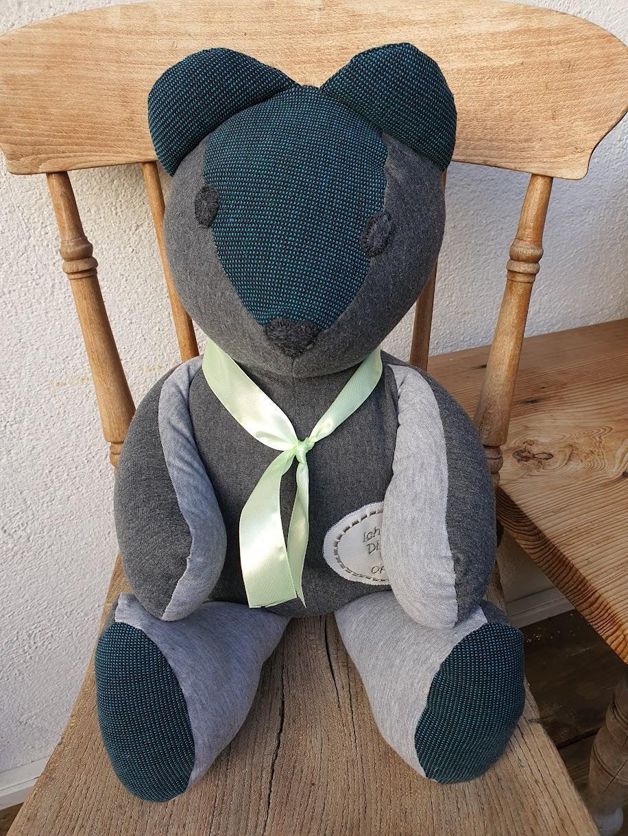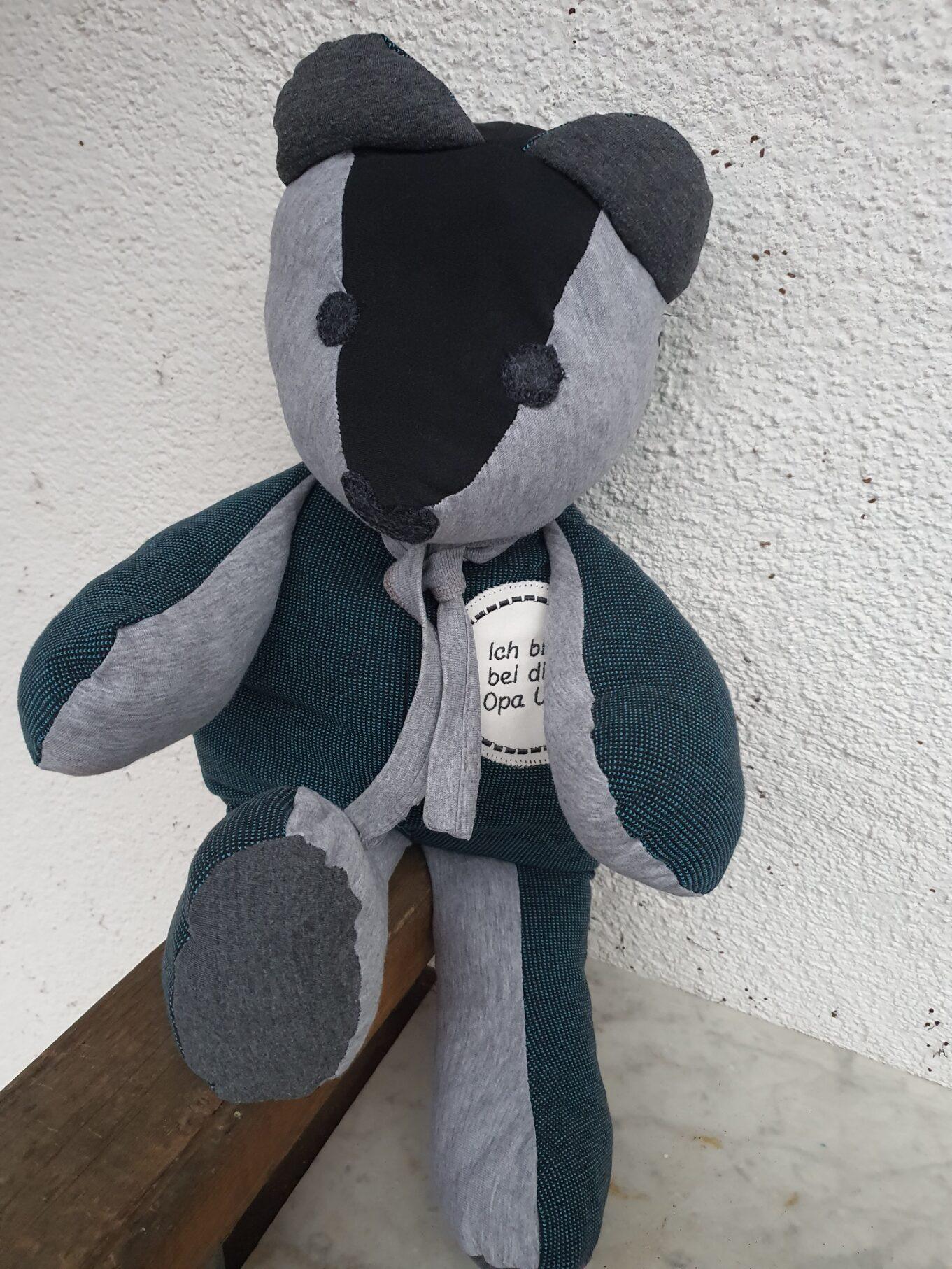 Er ist ein Schlenkerbär mit Armen und Beinen (sitzt also nicht steif nur auf dem Po). BENNY nähe ich immer individuell und unikat. Den Erinnerungsbär (keepsake, memorybear) fertige ich aus Lieblingskleidung, Baby- und Kinderkleidung oder auch aus Kleidung von Verstorbenen als treuer kleiner Begleiter, als Trost während der Trauerarbeit, als Andenken oder Stütze. Bestickungen auf Fußsohle oder als kleiner Quilt-Label (gratis).