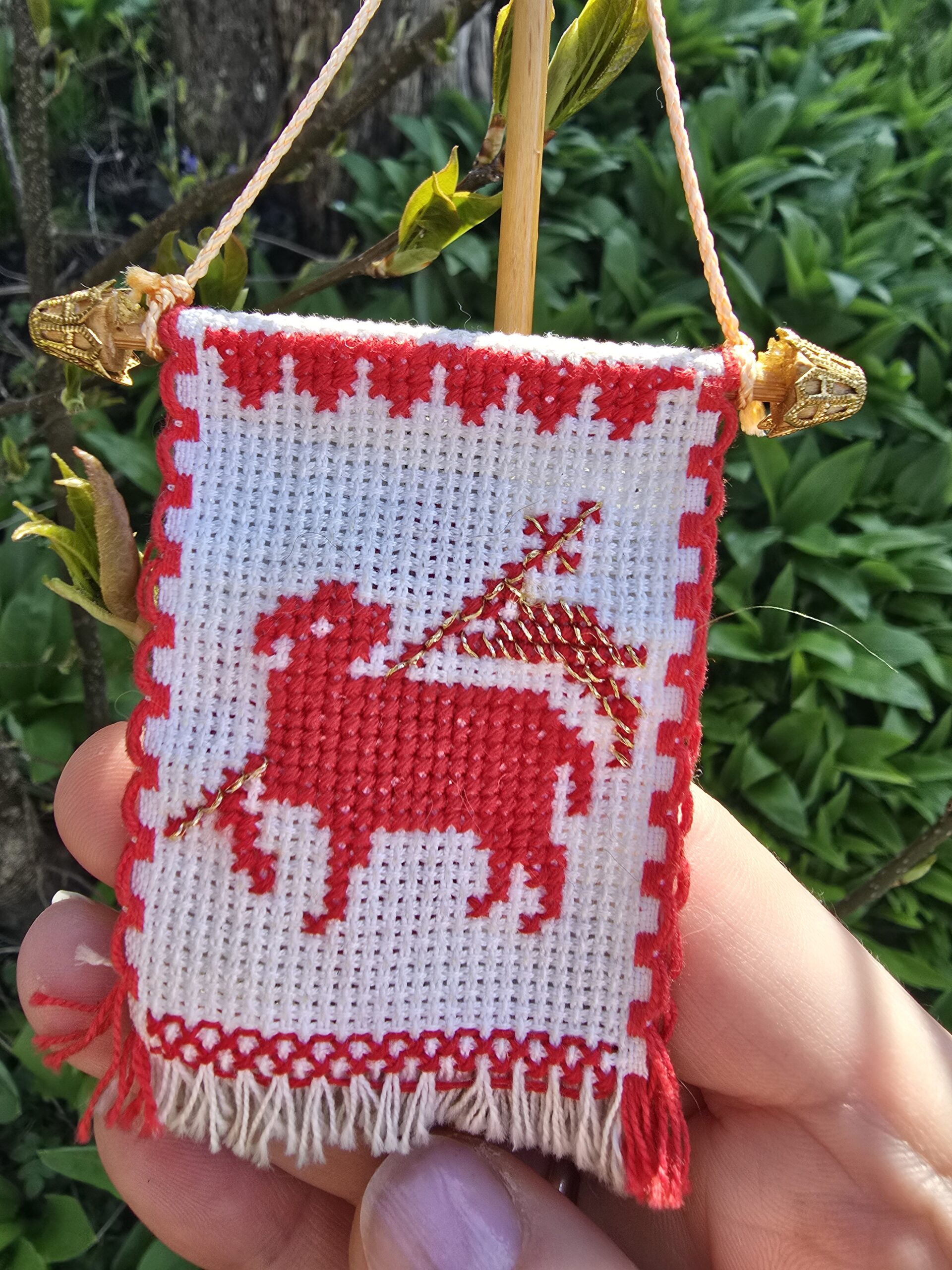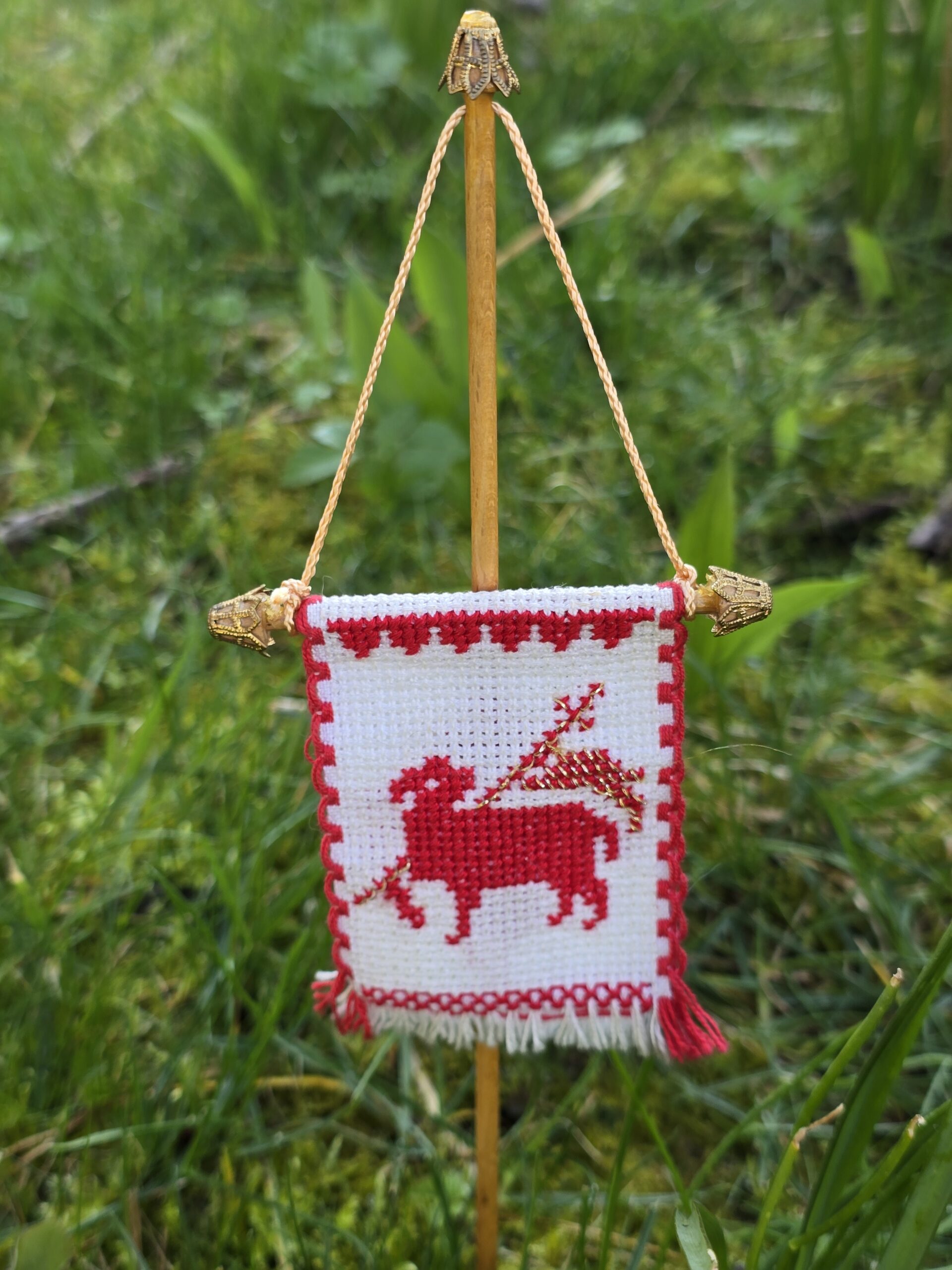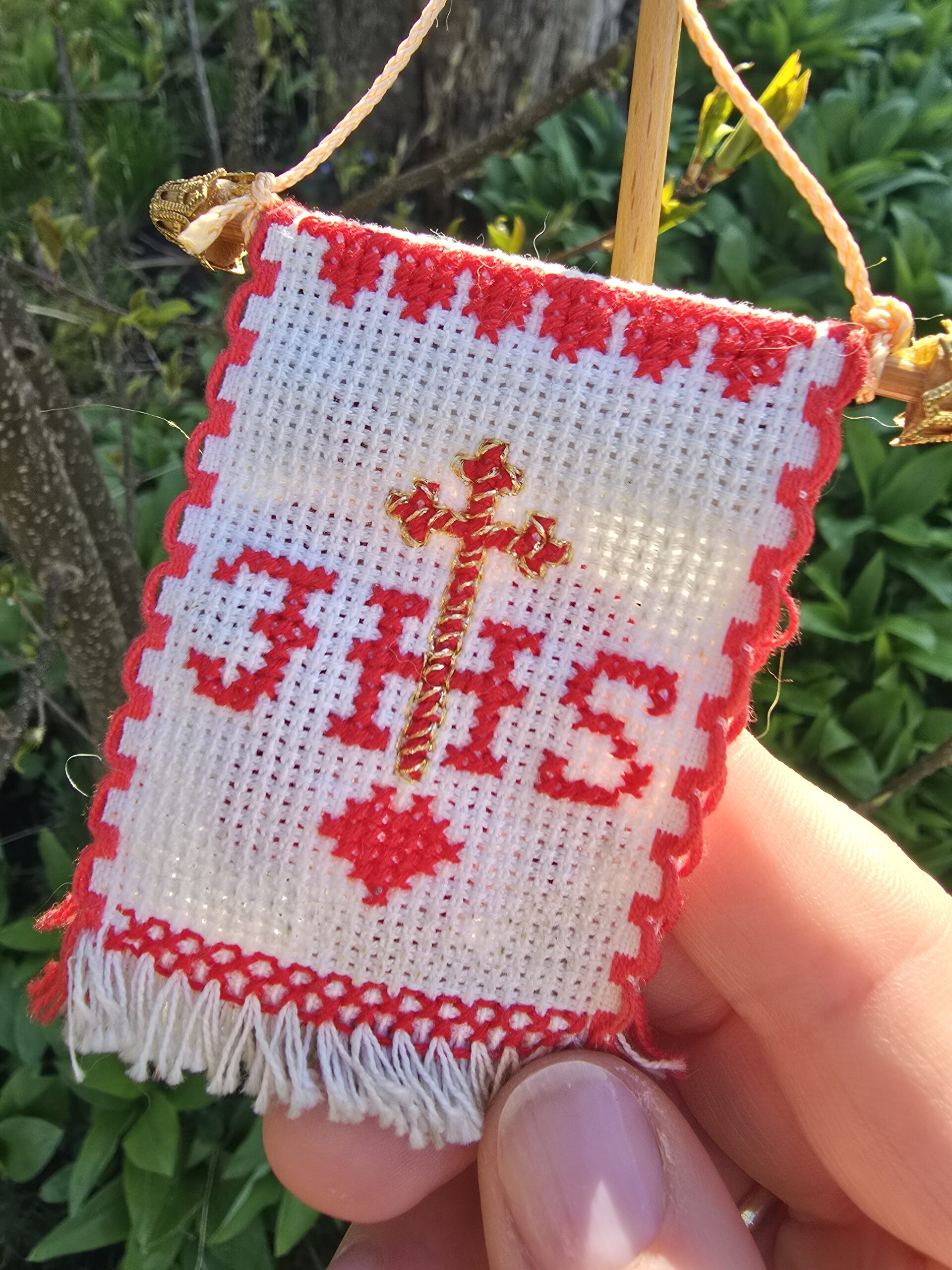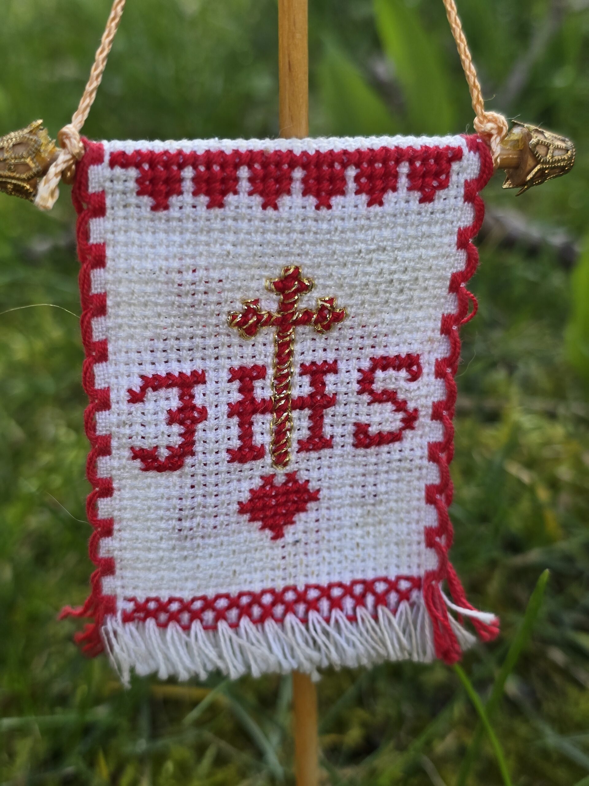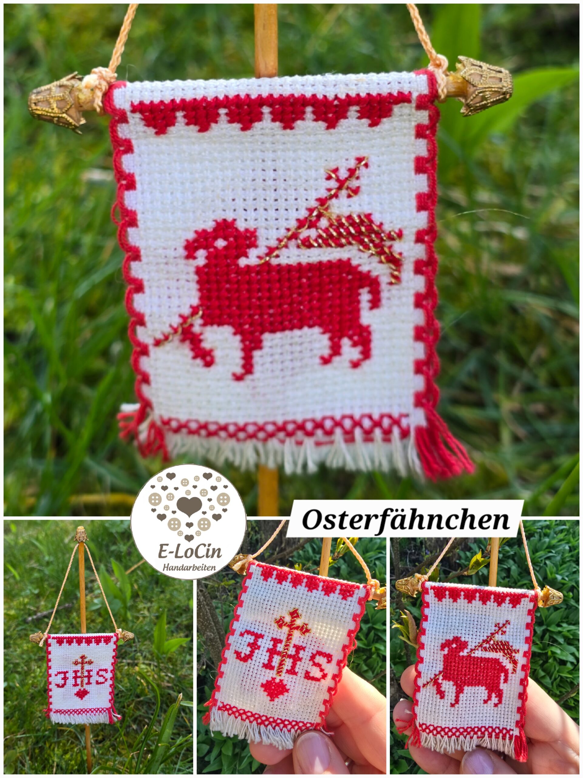 Dieses kleine Osterfähnchen sticke ich gerne abends vor dem Fernseher in ruhigen Abendstunden. Ich besticke es traditionell doppelseitig und mit 2 verschiedenen Symbolen: auf der einen Seite das IHS-Zeichen, auf der anderen das Osterlamm mit Auferstehungsfahne.