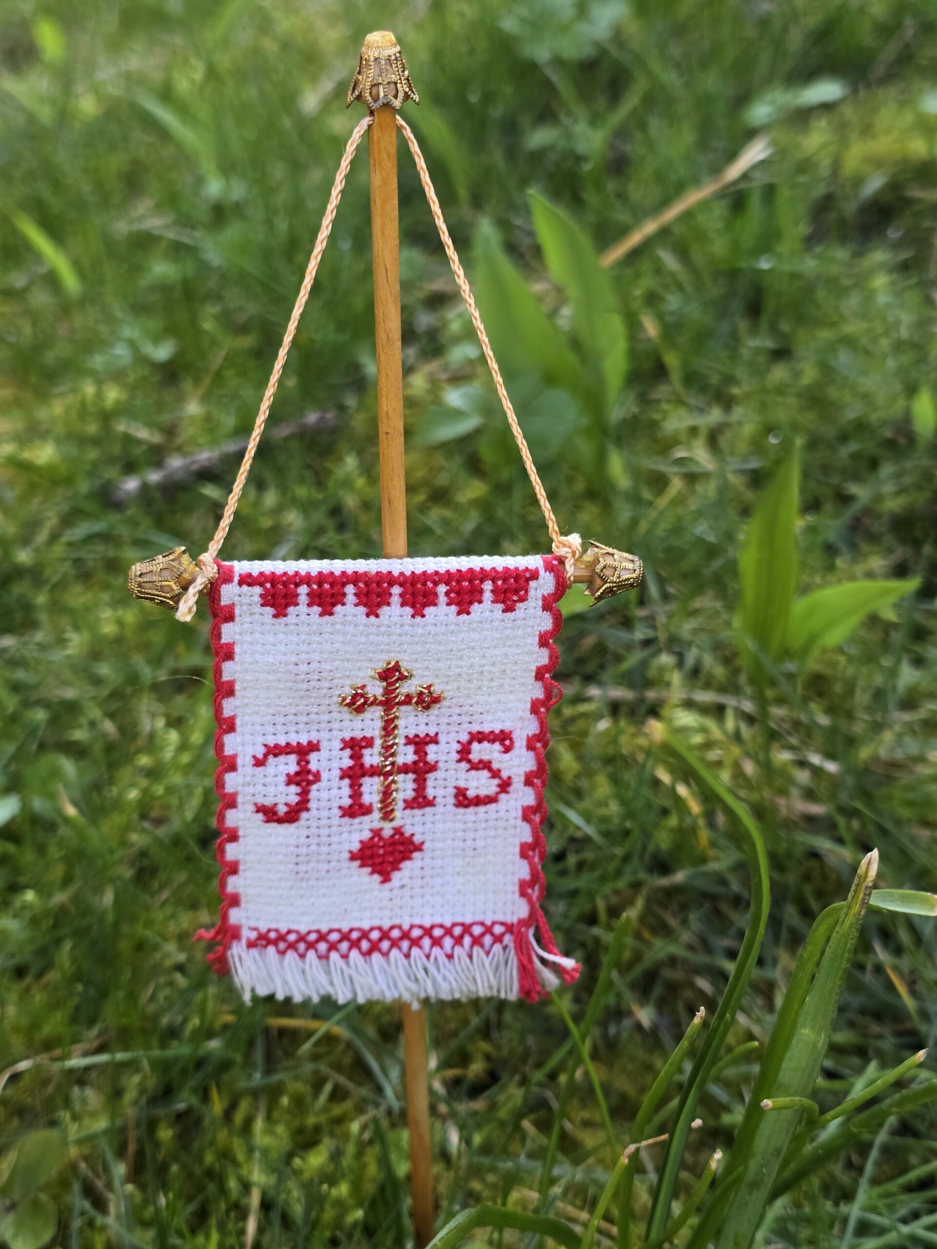Osterfähnchen für den Osterkorb, traditionell mit IHS und Osterlamm bestickt