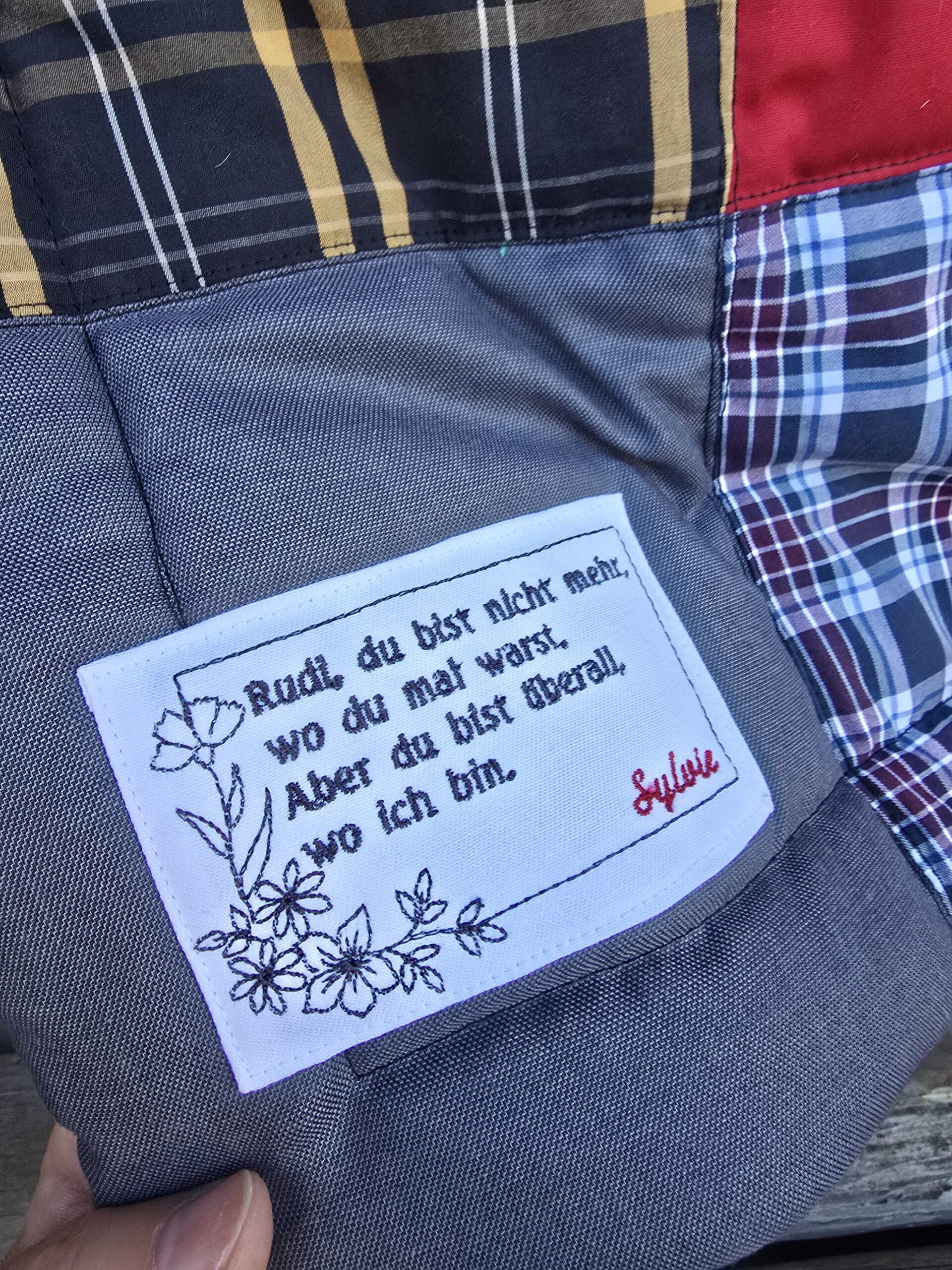 Ich möchte, dass Erinnerungen bleiben und fertige seit vielen Jahren mit Ruhe, Respekt und Feingefühl eine individuelle Patchwork-Erinnerungsdecke (Memorydecke) aus Kleidung eines geliebten, verstorbenen Menschen an. Es entsteht ein persönliches Erinnerungsstück, das dich umarmt, wärmt und Erinnerungen bewahrt. Jede Patchworkdecke fertige ich in sorgfältiger Handarbeit. Ich arbeite respektvoll mit deiner Kleidung, plane jede Decke zeitlich ein, um ihr die Zeit und Ruhe zu geben, die sie braucht. Kein 0815 und Schnell-Schnell!