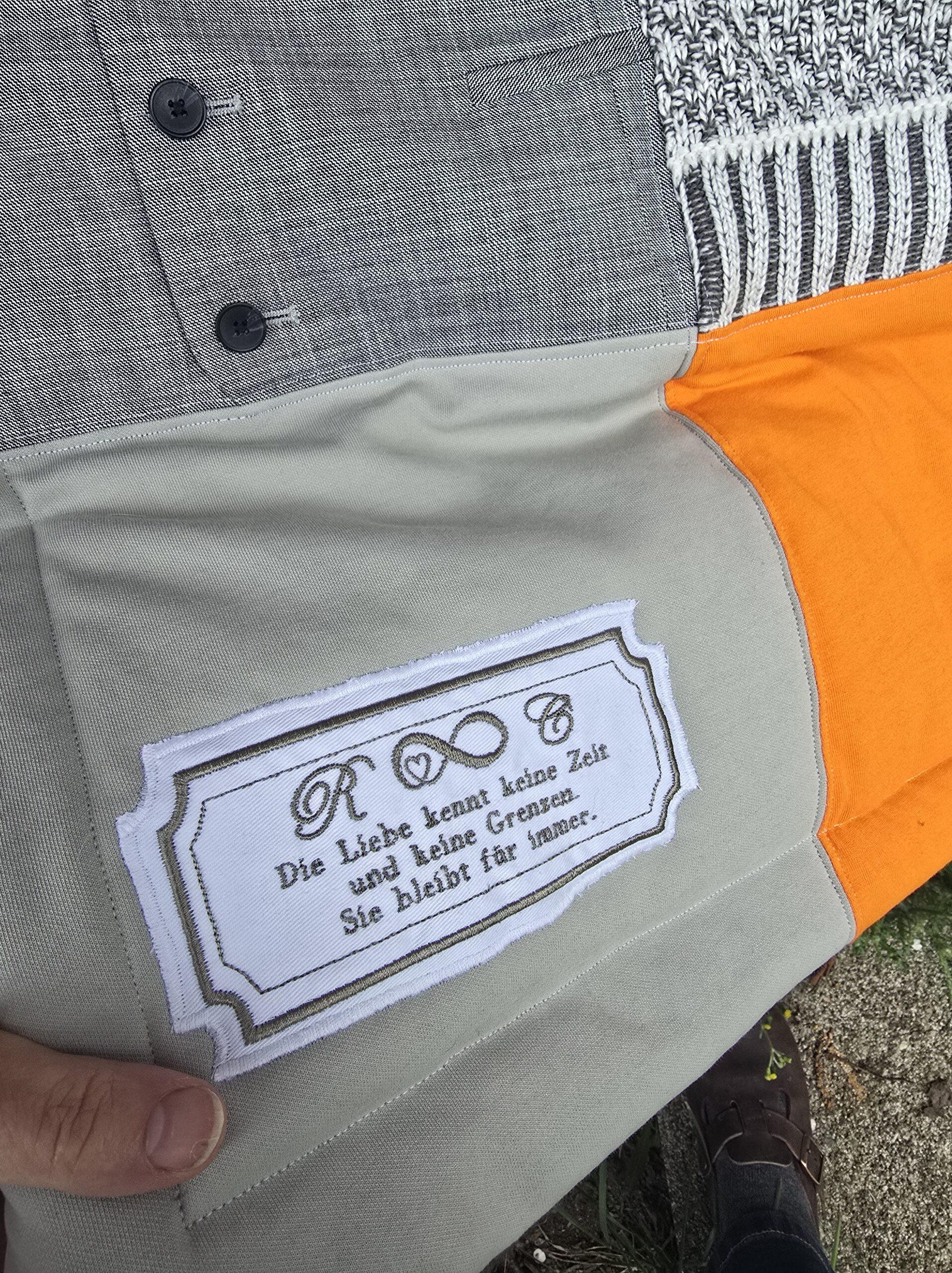 - Widmung: ein Wort, ein Text, ein Spruch … natürlich gratis. Ich sticke separat auf hellem Baumwollstoff.