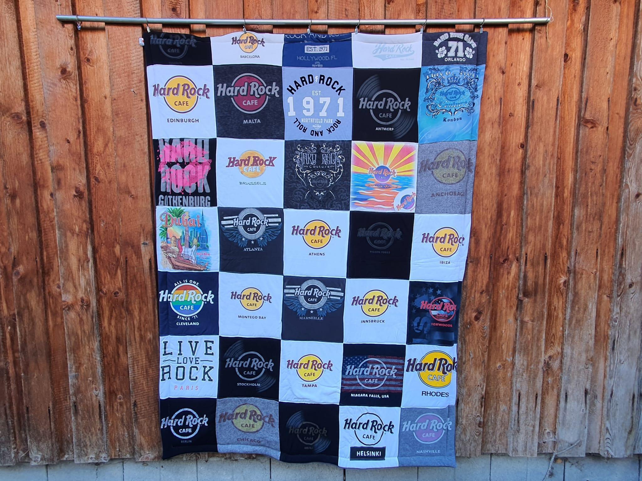Eine T-Shirtdecke besteht aus T-Shirts, Band T-Shirts, College T-Shirts, Souvenir T-Shirts, Festival T-Shirts, Urlaubserinnerungen, Sporttrikots, Laufshirts, Fußballtrikots, Radltrikots, Eishockey Trikots, Sweatshirts, Hoodies oder ähnliches. Gerne kann auch gemischt werden.