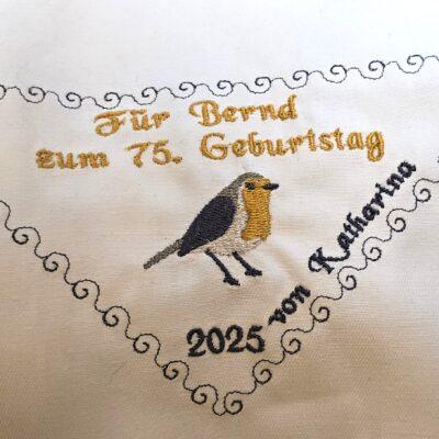Gestickt werden die “Schilder” auf weißem Körperstoff (etwas dickerer Baumwollstoff mit Struktur) in den Wunschfarben. Es kann ein Spruch sein, eine Widmung, ein Gedicht uvm.