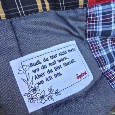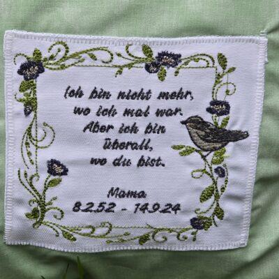 Ich designe sogenannte Quilt Label oder Stoffetiketten mit individuellem Wunschtext gestickt als Widmung zum Aufnähen auf Erinnerungskissen, Patchworkdecken, Kissenbezüge, Polster für Katzen usw., die wir zusammen gestalten.