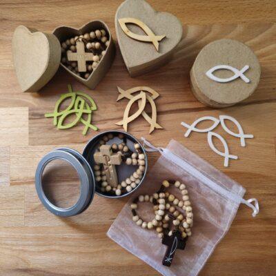 - Pappdöschen in Herzform oder rund. Je ca. 6 x 3 cm mit Deckel zum Selberdekorieren, Bemalen oder Bekleben oder natur belassen. Veriere sie mit z.B. mit einem Bändchen, Borte, den Holzfischen o.ä. (Dekoration und fertige Rosenkränze dienen hier nur der Darstellung)