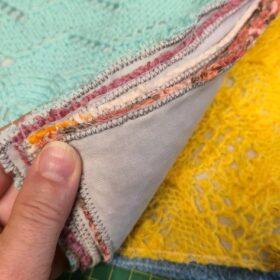 Heritage Blankets sind klein, praktisch und sorgen für eine Gemütlichkeit in Verbindung mit der Wertschätzung der gehäkelten und gestrickten Pullover, Schals und anderer Stücke. Damit die Maschen nicht aufribbeln und sich die Stücke nicht verziehen und aufdehen, unterlege ich jedes einzelne geschnittene Patch mit einem eigenen Baumwollstoff und bereite die Schnittkanten besonders vor, steppe sie ab und bereite sie nach.
