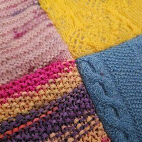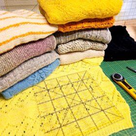 - die Patches werden 25 x 25 cm groß geschnitten bzw. wie es die Strickwaren hergeben