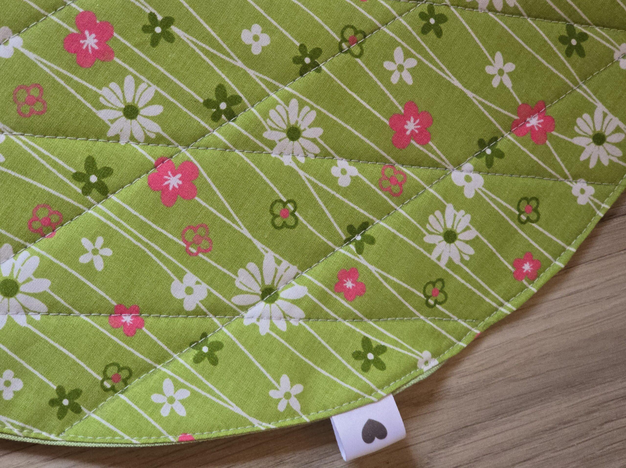 Ausführung: alle habe ich mit dem frischen Baumwollstoff “Gras” auf der Oberseite gefertigt, wattiert mit 0,5 cm Vlieseline und auf der Rückseite passenden frischen grünen Baumwollstoff. Alle Teilchen habe ich mit Quiltnähten abgesteppt in einem leichten luftigen Muster. Ich fand das ganz nett und dachte mir dieses Muster einfach so aus.