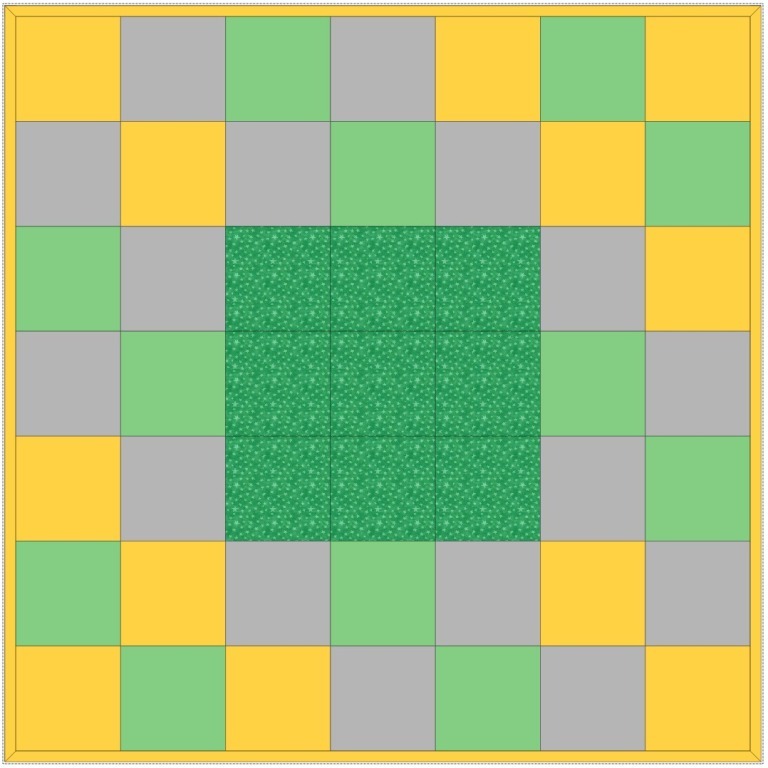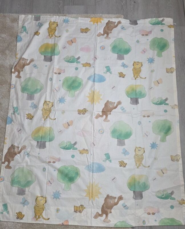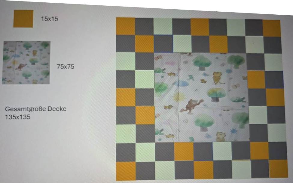 Chantal hatte einen 30 Jahre alten Stoff von Opa geschenkt bekommen für die 1. Krabbeldecke seines 1. Enkels. Ich habe mit ihr passende Stoffe ausgesucht, das Design erstellt und so ist die 130 x 130 cm dicke Krabbeldecke entstanden.
